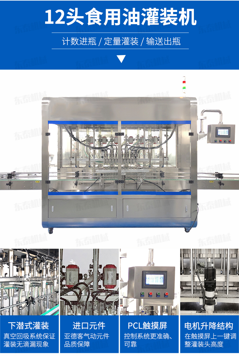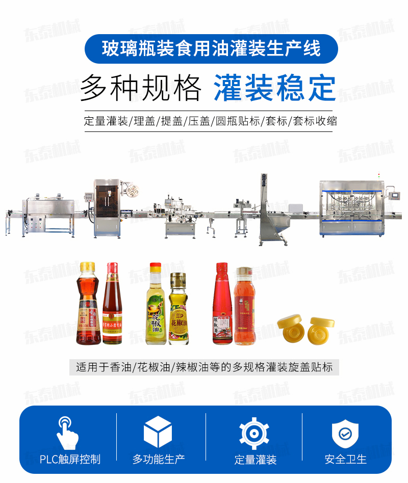 該系列灌裝機(jī)采用容積式計量灌裝原理,適用于各種規(guī)(100ml-1000ml)的南瓜籽油、榛子油、牡丹籽油、芝麻油、核桃油、山茶油、亞麻籽油、棉籽油、橄欖油、大豆油、玉米油、菜籽油等食用油灌裝。設(shè)備采用伺服驅(qū)動活塞計量,保證了 1‰的灌裝精度,在保證灌裝精度的同時,提高了 20%-35%灌裝速度,操作簡單,維護(hù)方便,節(jié)省人工成本,生產(chǎn)效率更高。