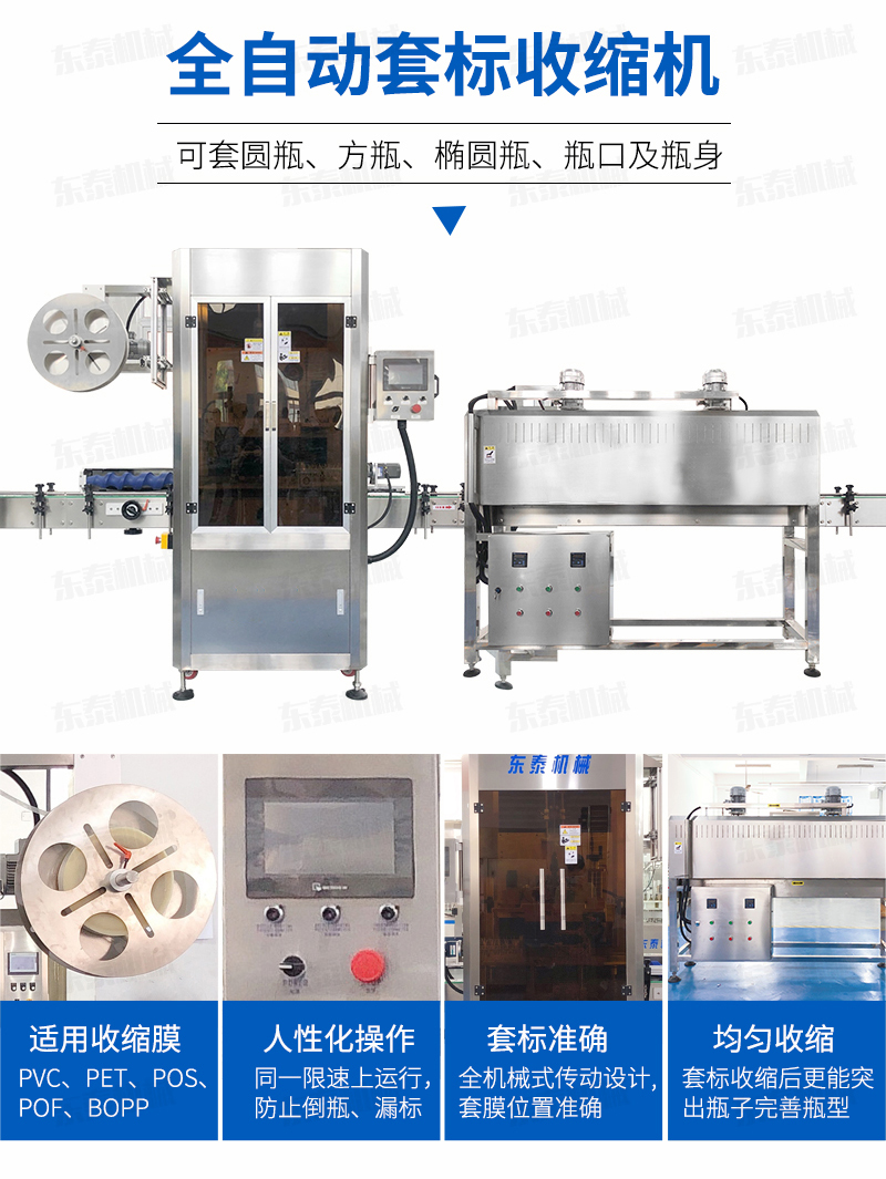 1. 本公司生產(chǎn)的套標(biāo)機(jī)適用于各種瓶型的果汁、茶飲料、乳制品、純凈水、調(diào)味品、啤酒、運動飲料等食品飲料行業(yè)、不但套標(biāo)位置度高,且收縮后更能突出瓶子完善瓶型。