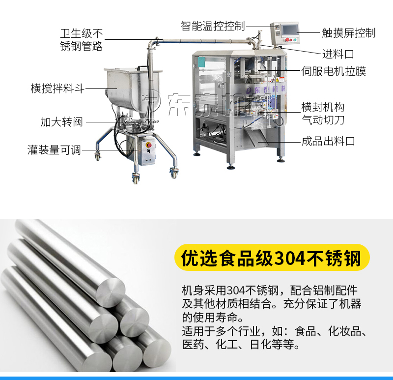 本機(jī)器主要用于調(diào)味品醬料的自動(dòng)化包裝,機(jī)器安裝有橫向螺帶式攪拌,使油醬混合均勻,確保灌裝精度和產(chǎn)品包裝成品的均勻性。灌裝計(jì)量設(shè)備安裝有萬(wàn)向輪,管路鏈接均采用快拆接頭,方便灌裝機(jī)拆卸移動(dòng)清洗。包裝設(shè)備采