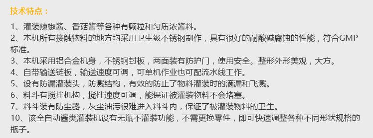 灌裝機(jī)采用活塞式灌裝原理,適用于調(diào)味品中帶顆粒并且濃度較大的辣椒醬、豆瓣醬、花生醬、香菇醬、果醬、牛油火鍋底料、紅油火鍋底料、蝦醬等較為粘稠醬類的灌裝。