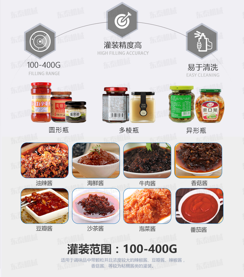 顆粒醬灌裝機(jī)采用活塞式灌裝原理,適用于調(diào)味品中帶顆粒并且濃度較大的辣椒醬、豆瓣醬、花生醬、香菇醬、果醬、牛油火鍋底料、紅油火鍋底料、蝦醬等較為粘稠醬類的灌裝。