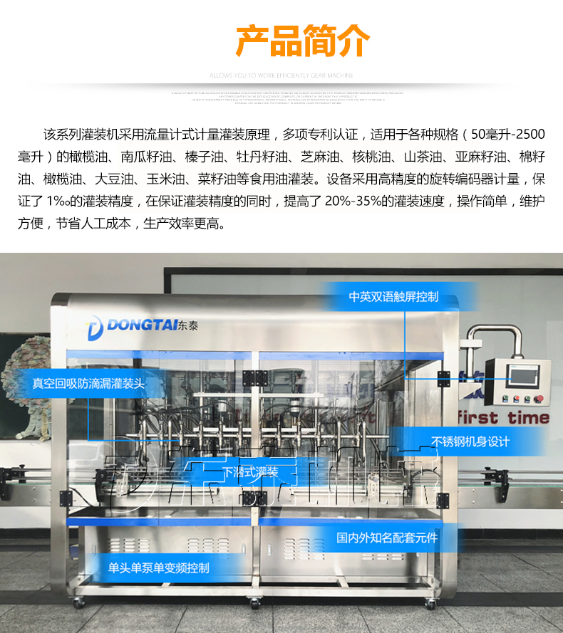 東泰機械至今有著二十年的研發(fā)生產(chǎn)經(jīng)驗,擁有著精良的技術(shù)團隊,東泰研發(fā)的橄欖油自動灌裝機,橄欖油灌裝流水線都是機電一體的新型設(shè)備,橄欖油自動灌裝機計量采用高精度流量計與微電子數(shù)控儀表相結(jié)合的方式,灌裝精度相當(dāng)高,還可以方便的進行無級調(diào)解灌裝容量,非常直觀,操作非常簡單。選擇包裝設(shè)備就要選經(jīng)驗豐富、技術(shù)超前,設(shè)備完善的的大企業(yè),東泰機械通過二十多年的努力和發(fā)展,現(xiàn)已成為集科研、設(shè)計制造、成套供應(yīng)、技術(shù)咨詢服務(wù)、工程總承包為一體的高科技型企業(yè)。東泰期待與您的合作,我們互利共贏!