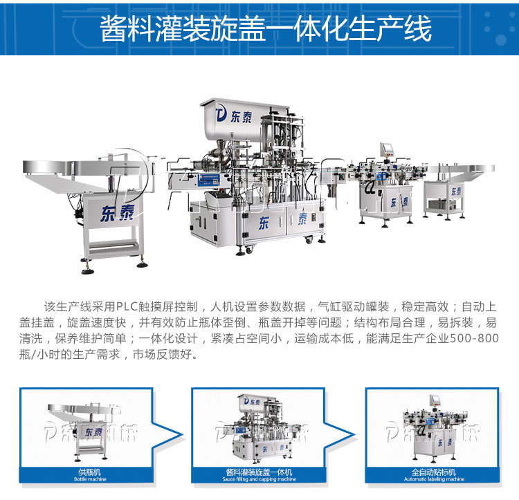 作為國(guó)內(nèi)專(zhuān)業(yè)的醬料灌裝機(jī)廠家,我們東泰機(jī)械能夠在市場(chǎng)中不斷實(shí)現(xiàn)創(chuàng)新和突破,是我們結(jié)合了市場(chǎng)的真實(shí)情況以及客戶(hù)的真實(shí)需求來(lái)不斷跟隨市場(chǎng)的需求和需要進(jìn)行變化,從而掌握市場(chǎng)的主動(dòng)權(quán),才致使醬料灌裝機(jī)朝著高端化、智能化的方向前行,來(lái)得到更多消費(fèi)者的好評(píng)和認(rèn)可,辣椒醬再我們生活之中已經(jīng)是屬于再熟悉不過(guò)的產(chǎn)品了,雖說(shuō)醬料的好處比較多,也可以提高食物的口味,但是你可能不知道的是,味道好的醬料也是離不開(kāi)包裝,既然有了包裝的需求自然離不開(kāi)醬料灌裝機(jī)。